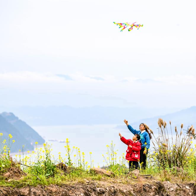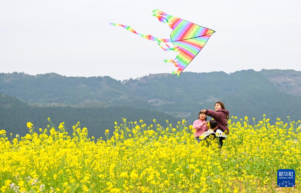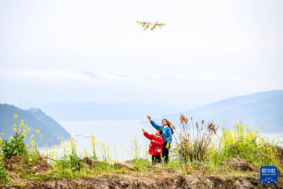 2月28日,一位母亲带着孩子在长江岸边的油菜花海里放风筝。