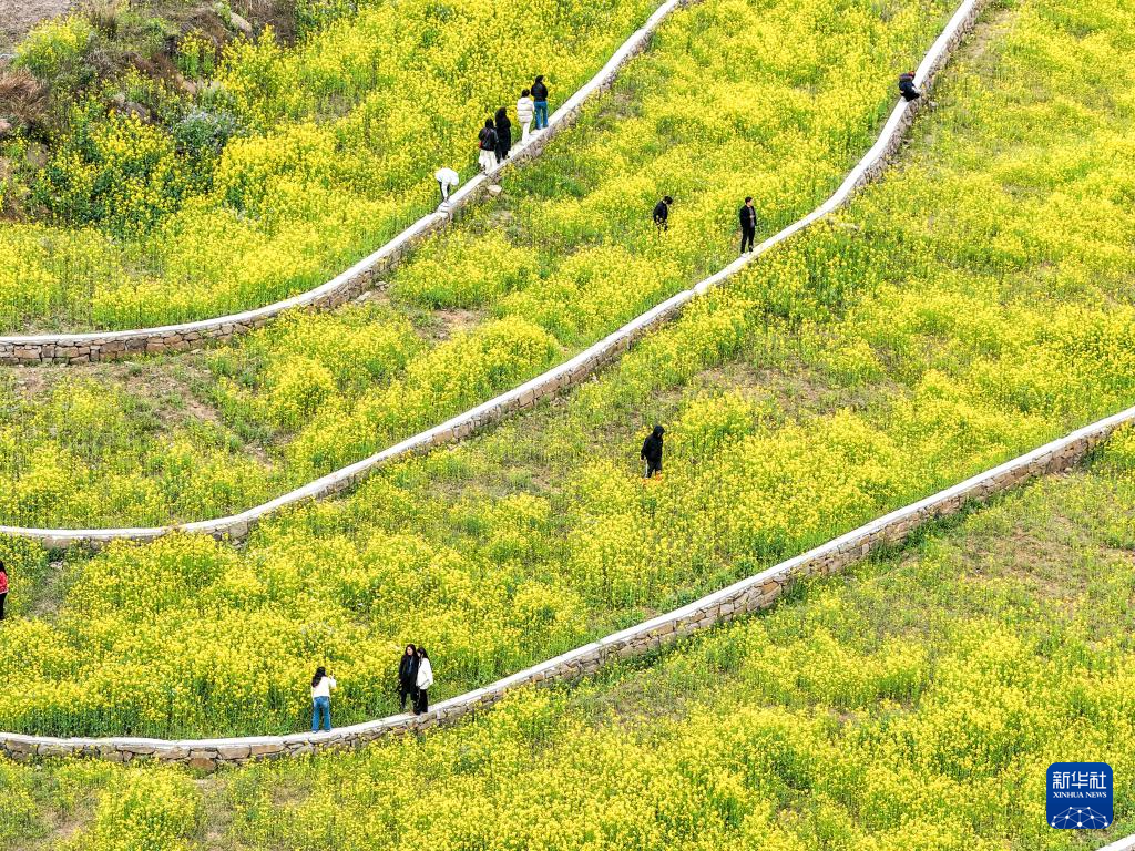 随着气温回升,重庆市丰都县高家镇汶溪社区长江沿岸的600亩油菜花竞相绽放,吸引游客前来踏青赏花。