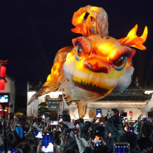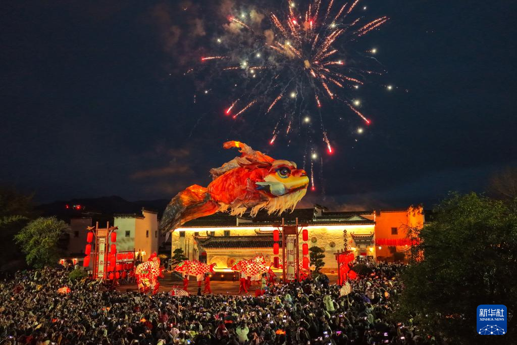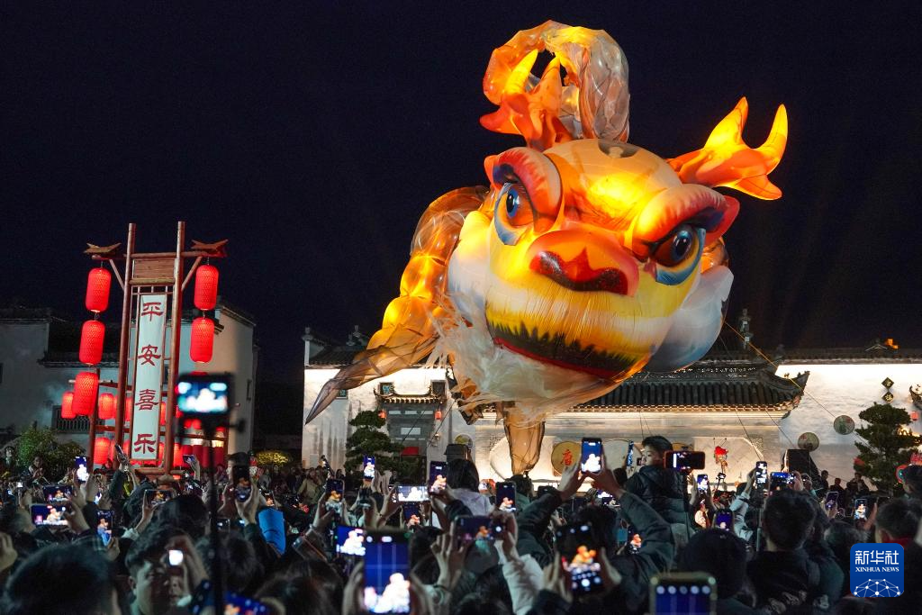 农历正月十一,在安徽省黄山市徽州区唐模古村,“徽州满池娇·独占鳌头”主题活动火热开展。巨大的鳌鱼灯在夜色中流光溢彩,伴随锣鼓队伍在古村上空飞旋,寓意“抬头见喜、独占鳌头”,吸引众多游客和市民驻足围观、拍照打卡,为即将到来的元宵佳节增添浓厚的节日氛围。