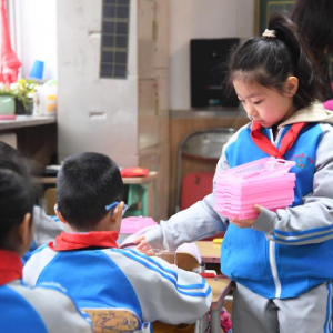 3月2日,在北京市平谷区第一小学,二年级(9)班的学生在课前发教具。