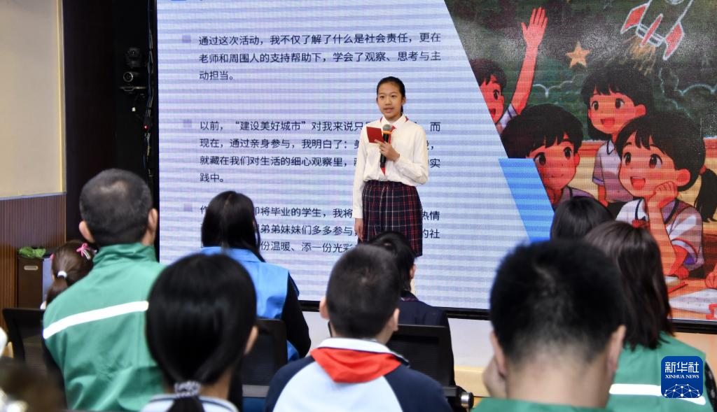 3月2日,北京黑芝麻胡同小学学生在开学典礼上讲述假期故事。