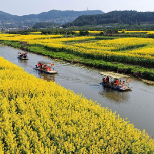 3月5日,游客在四川省南充市蓬安县正源镇石牛村乘坐游船赏花游玩(无人机照片)。