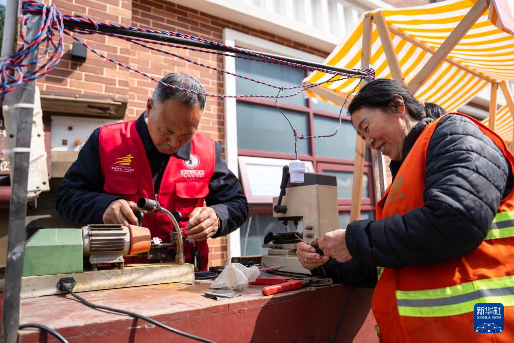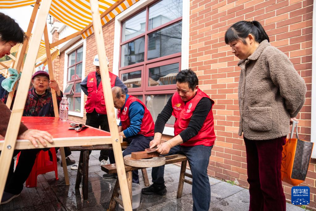 3月5日,在长沙市望城区高塘岭街道雷锋路社区雷锋驿站,志愿者(右二)为市民磨菜刀。