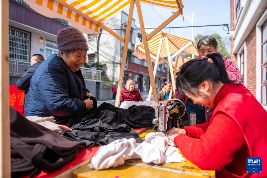 3月5日,在长沙市望城区高塘岭街道雷锋路社区雷锋驿站,志愿者(右一)为市民缝纫衣物。