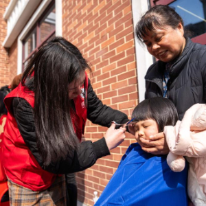 3月5日,在长沙市望城区高塘岭街道雷锋路社区雷锋驿站,志愿者(左一)为市民贴手机膜。