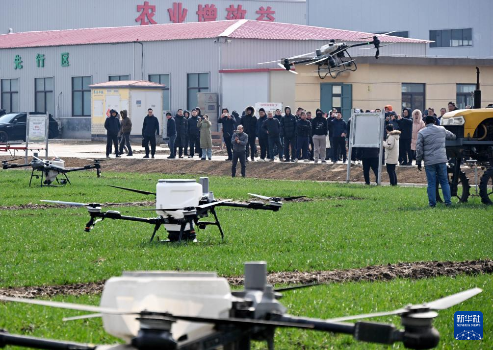 3月6日,在青岛市即墨区蓝村街道壮武村,植保无人机进行喷防演示。