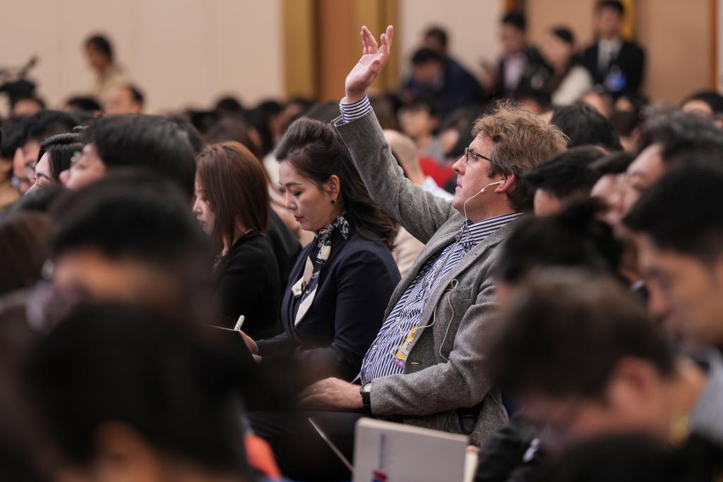 3月6日,十四届全国人大四次会议在北京梅地亚中心新闻发布厅举行记者会。国家发展和改革委员会主任郑栅洁、财政部部长蓝佛安、商务部部长王文涛、中国人民银行行长潘功胜、中国证券监督管理委员会主席吴清就发展改革、财政预算、商务、金融证券等相关问题回答中外记者提问。这是记者举手提问。