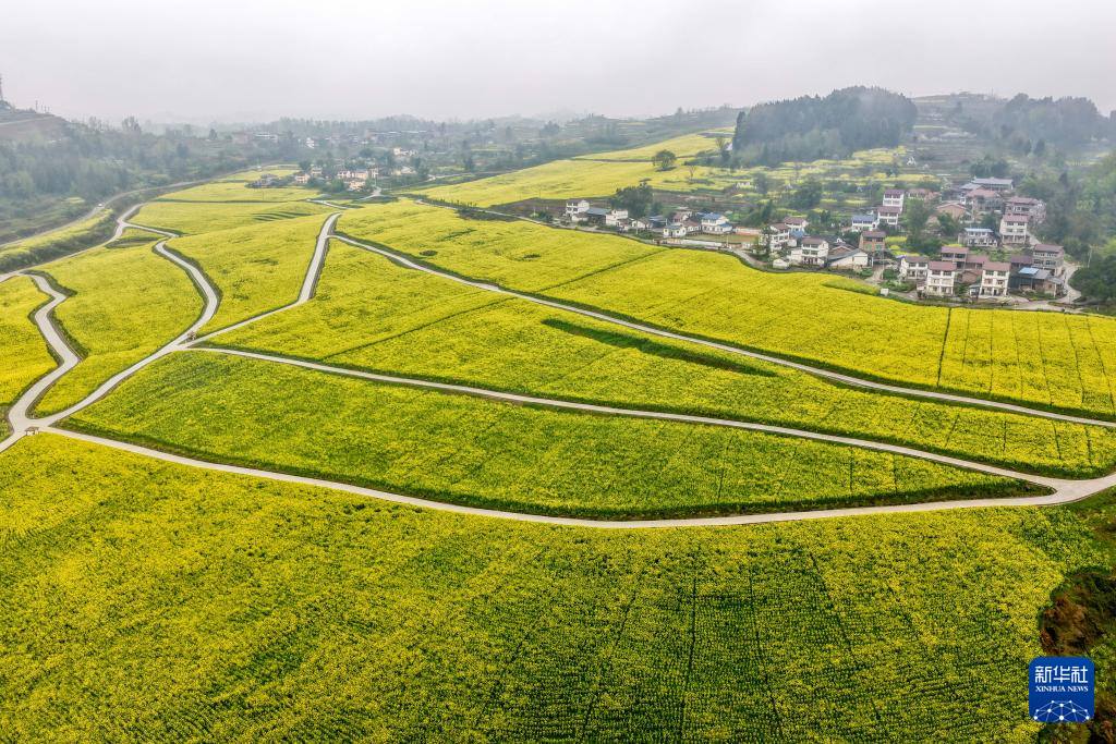 近日气温回暖,重庆市石柱土家族自治县黎场乡秀才村的千余亩油菜花进入盛花期,金黄色的花海将山村田园装扮成一幅美丽的春日画卷,吸引了游客前来踏青赏花,感受春天气息。