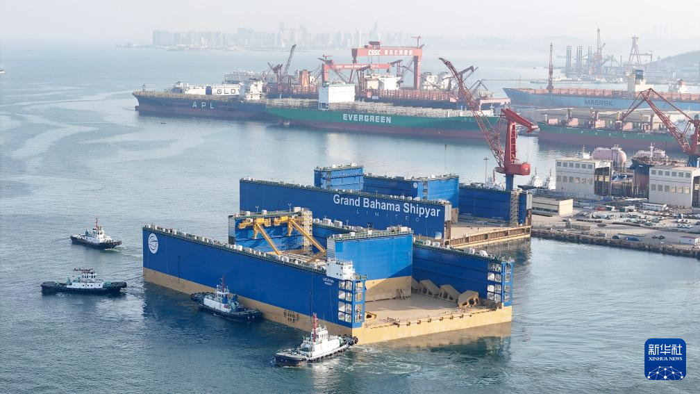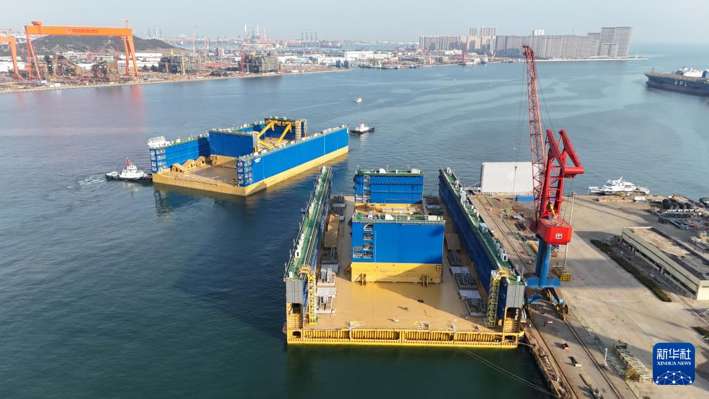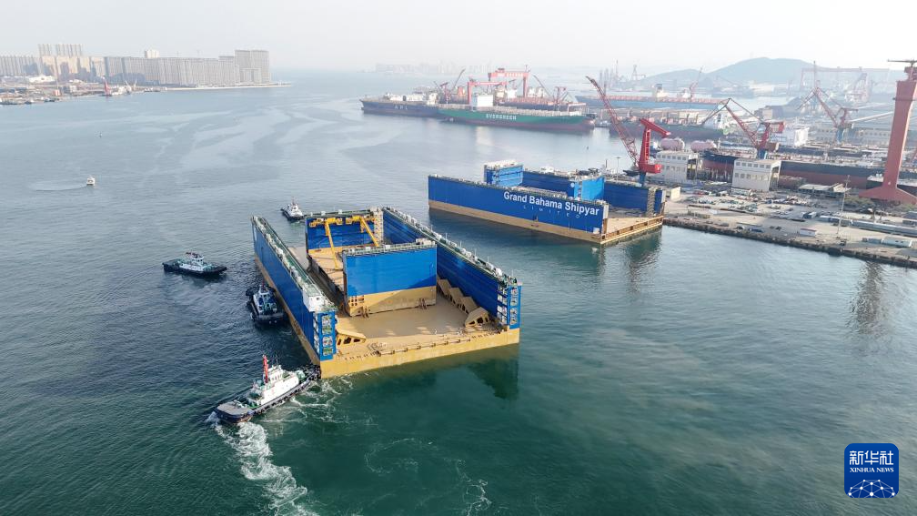 3月8日,12万吨举力浮船坞“Lucayan”号首段,从青岛西海岸新区北海造船3号码头离港(无人机照片)。