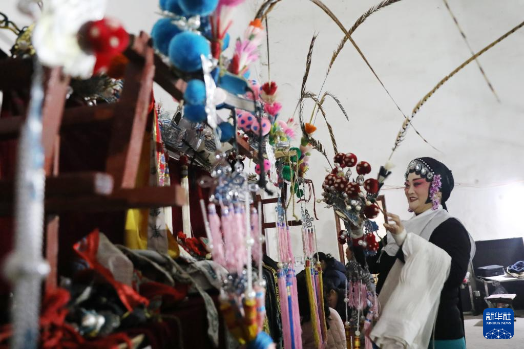 3月7日,演员在河南省焦作市温县武德镇村文化中心候场时整理道具。