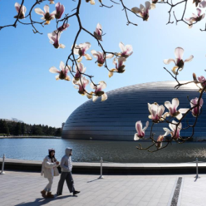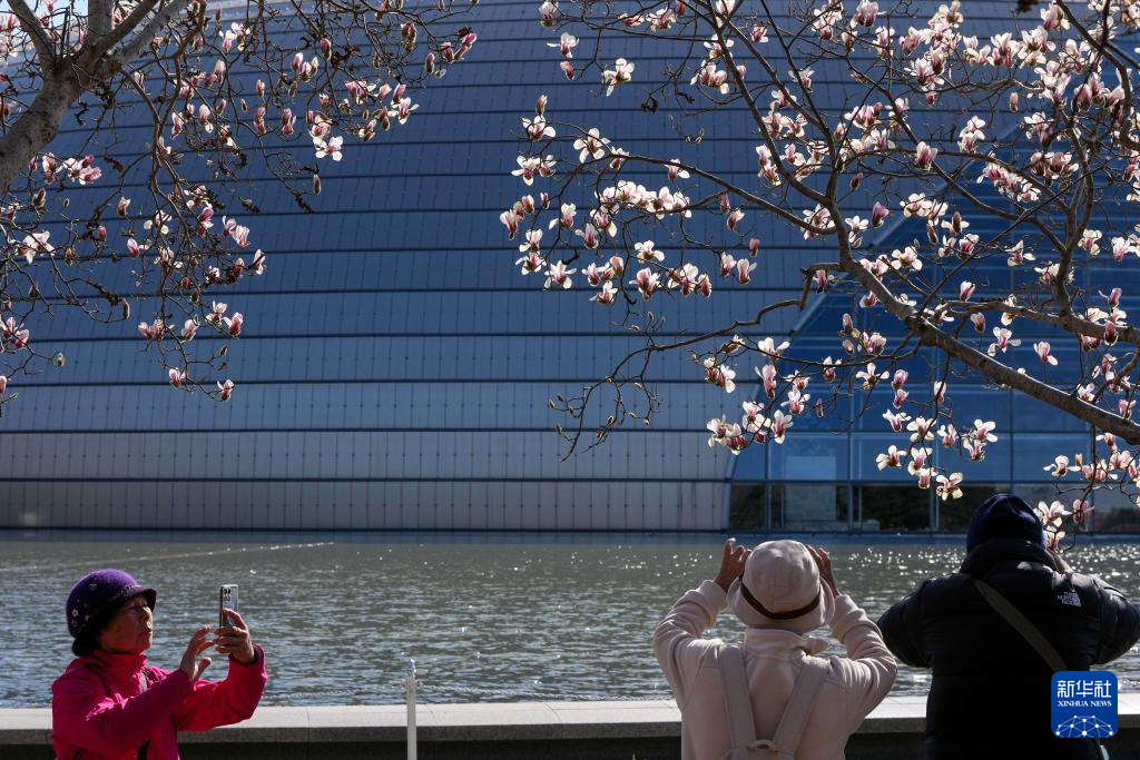 3月9日,游客在国家大剧院旁欣赏盛开的玉兰花。
