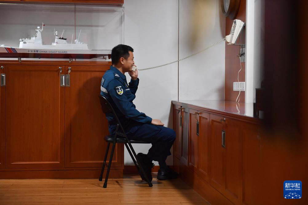 3月8日,海警三都舰执法员在休息时间与家人通话。