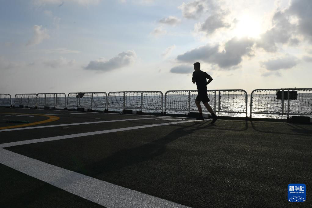 3月8日,落日时分,海警三都舰执法员在甲板上跑步锻炼。