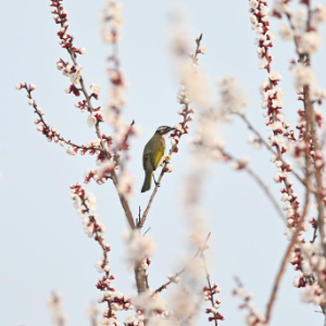 3月12日,在山东省滕州市西岗镇一公园,小鸟在花间嬉戏觅食。