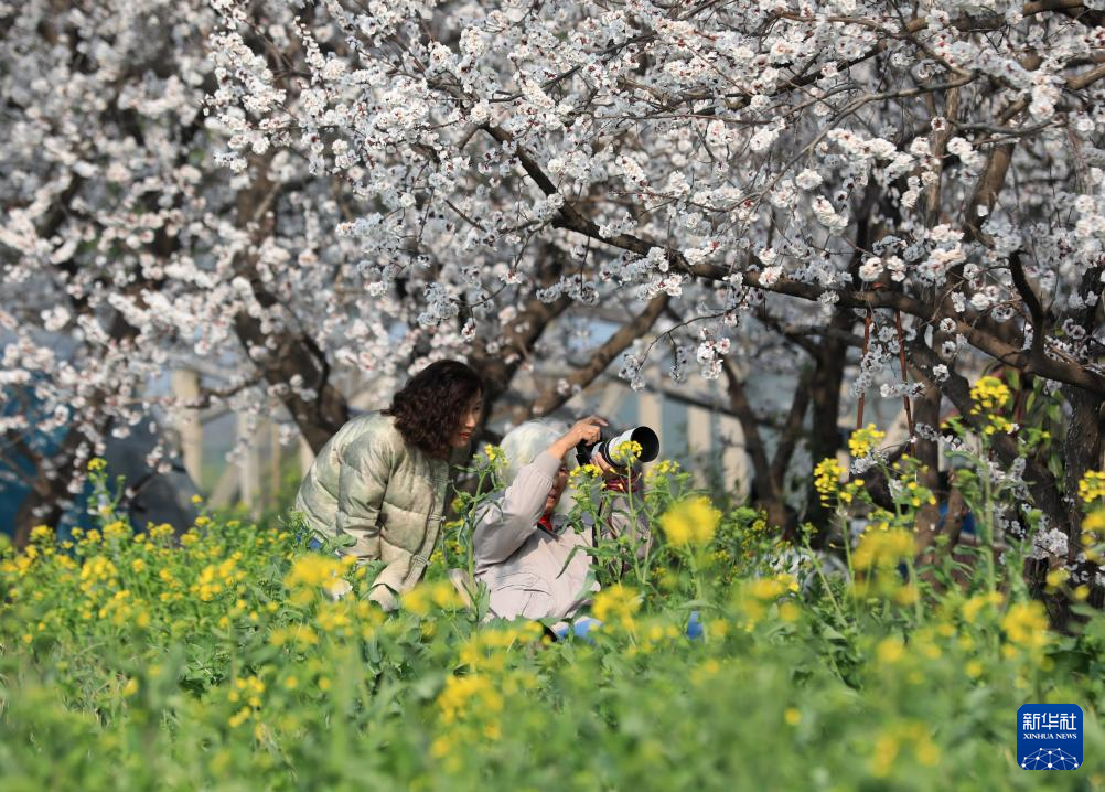 3月11日,游人在杏花盛开的河南省鹤壁市淇滨区泰山路街道办事处福田社区游玩拍照。