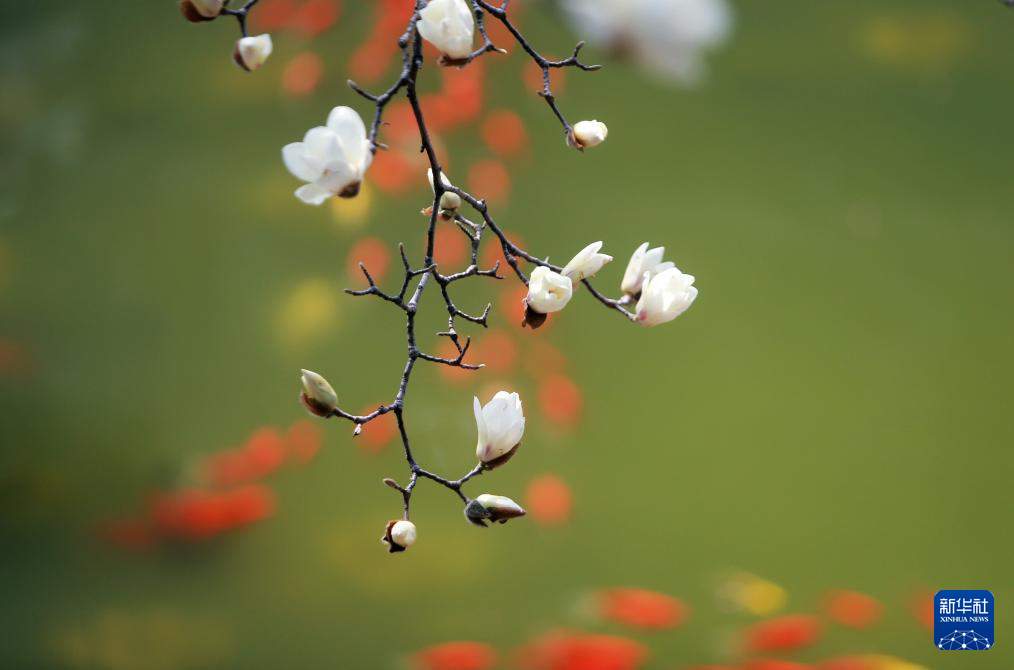 3月10日,江苏省扬州市何园景区绽放的玉兰花与水中鱼儿相映成趣。
