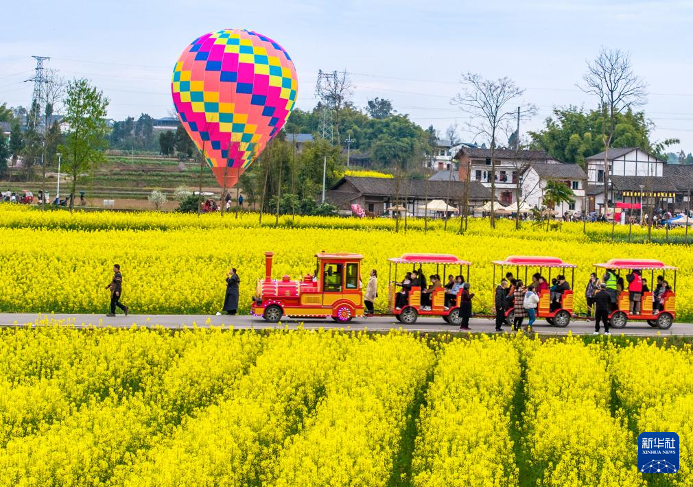 3月9日,在四川省达州市渠县有庆镇太阳村油菜花田间,游客乘坐小火车观赏油菜花。