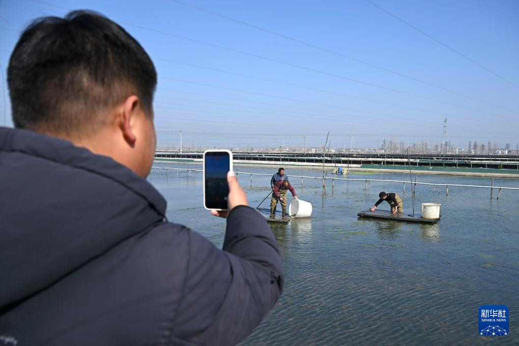 3月13日,在蚌埠市五河县申集镇黄李村的螃蟹养殖基地,朱彩胜用手机记录养蟹日常。