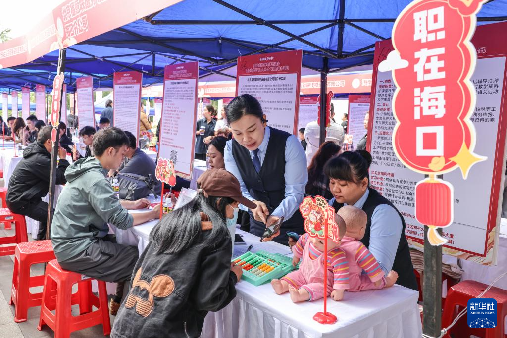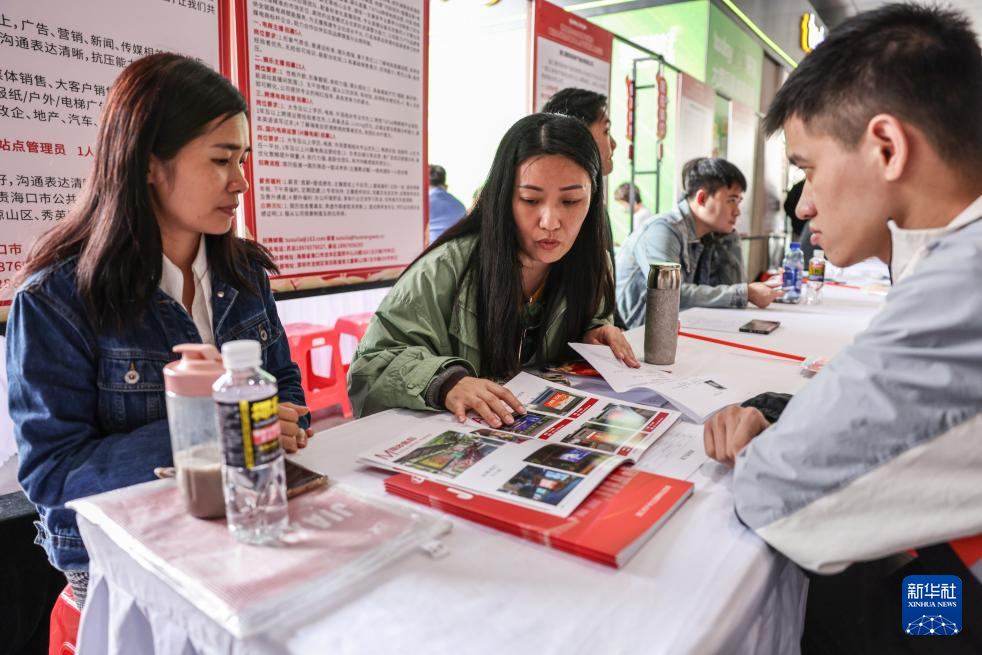 3月13日,在海口市2026年春节返乡高校大学生与青年人才专场招聘会现场,求职者在职业指导区了解就业政策。
