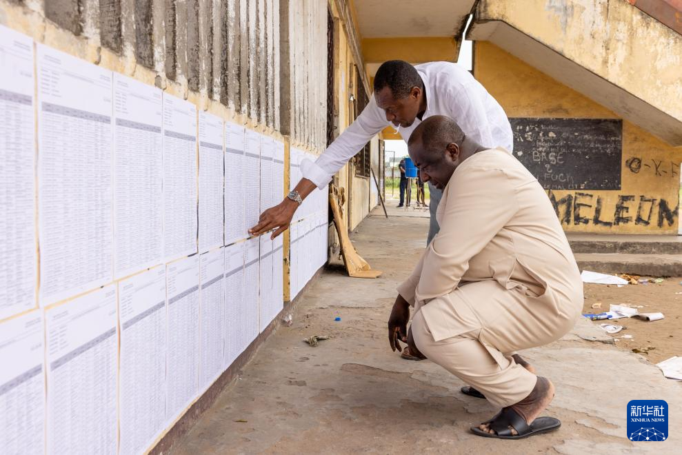 3月15日,两名刚果(布)选民在布拉柴维尔的一处投票站外查看选区信息。