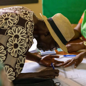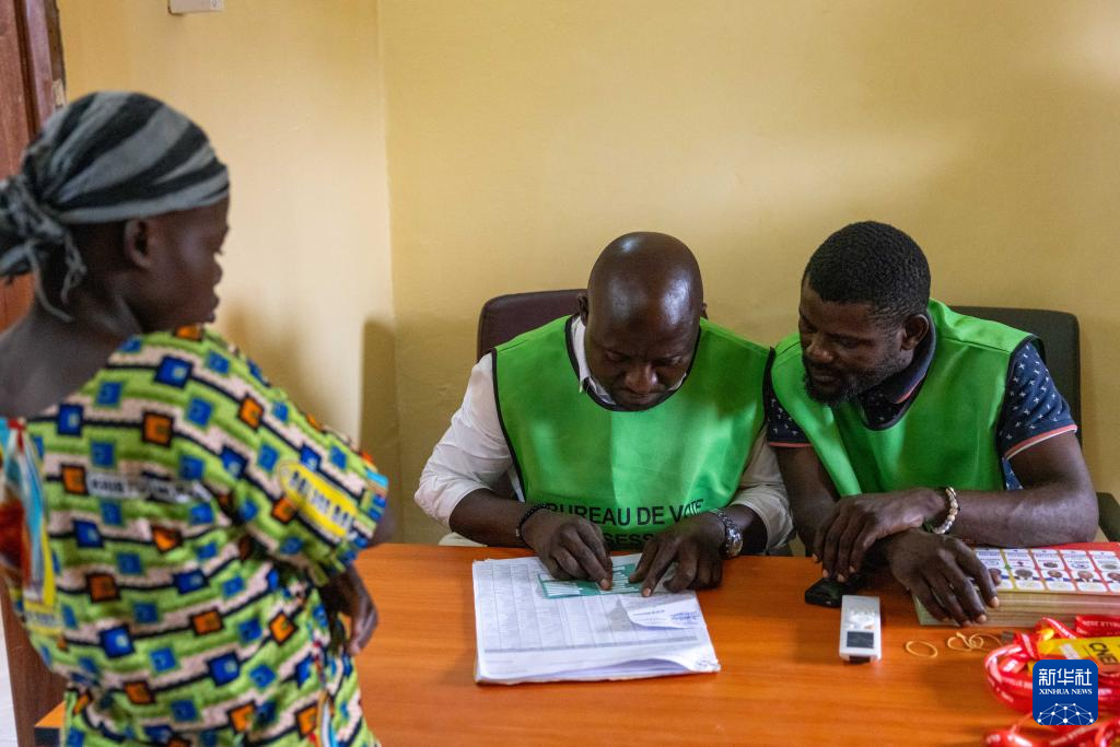 3月15日,刚果(布)首都布拉柴维尔一处投票站的工作人员正在核实选民信息。