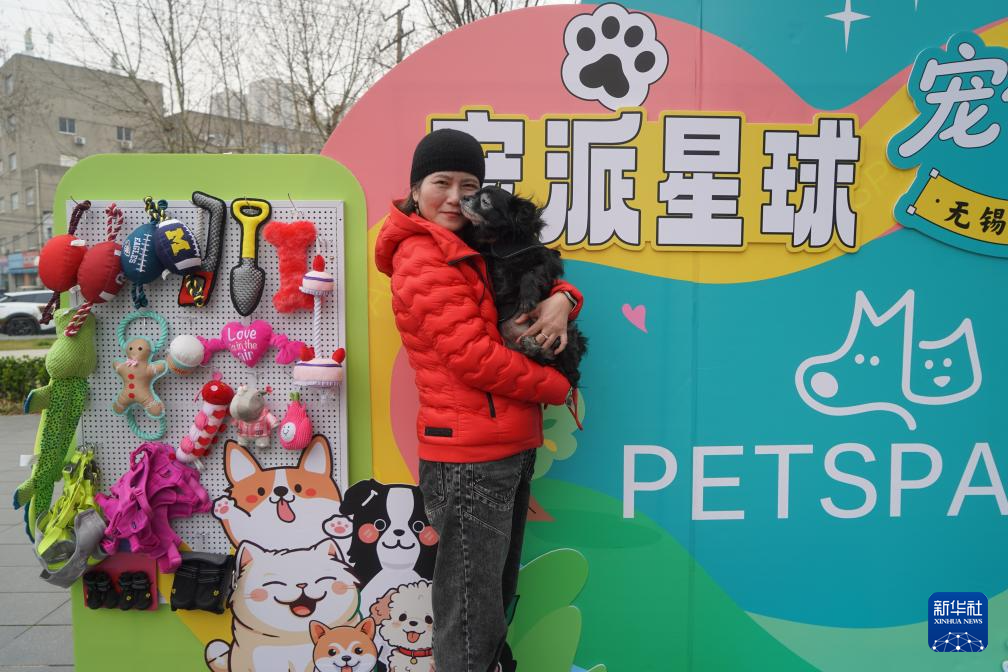 3月15日,在无锡市运河汇街区,一位女士抱着宠物狗在活动展板前打卡。