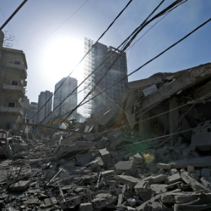 这是3月18日在黎巴嫩首都贝鲁特拍摄的在以色列空袭中损毁的建筑。