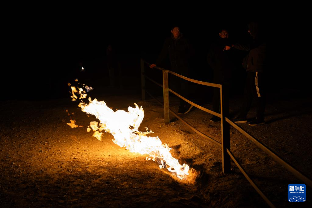 3月19日晚,人们在土库曼斯坦达瓦扎天然气坑游览。