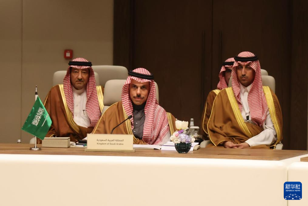 3月19日凌晨,在沙特阿拉伯首都利雅得,沙特外交大臣费萨尔(中)出席部长级磋商会议。