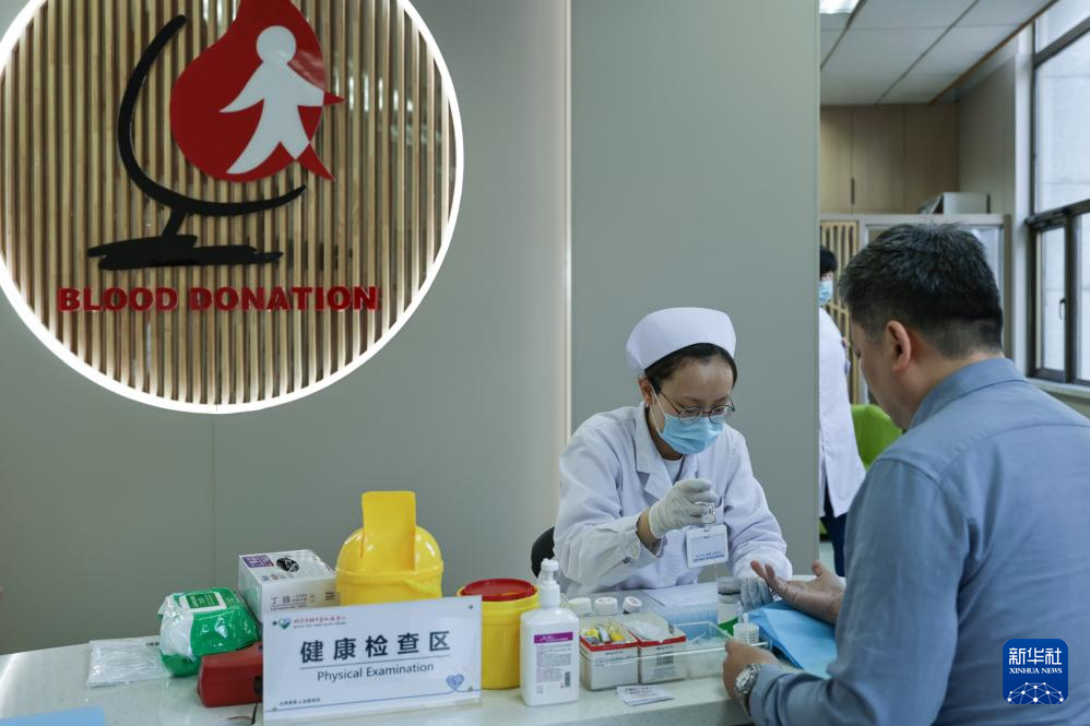 3月20日,在北京市红十字血液中心举行的团体献血活动上,医护人员进行献血前健康筛查。