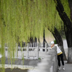 3月19日,一位晨跑的市民在西安城墙环城公园玉祥门至安定门段护城河畔拍摄春柳。