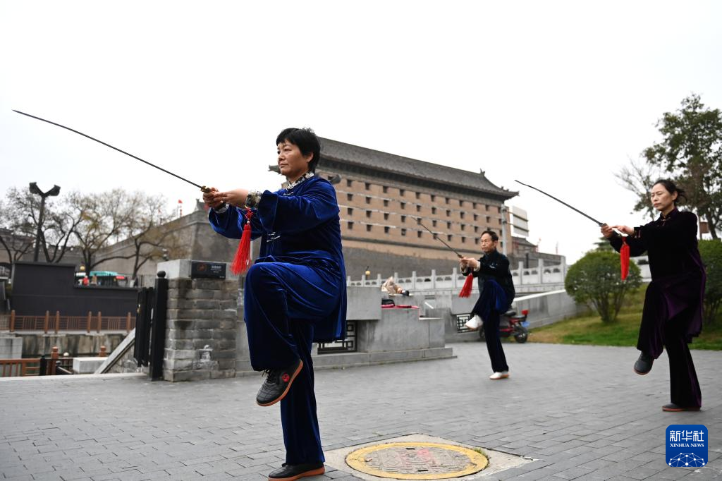 3月19日,市民在西安城墙环城公园安定门外练习太极剑。