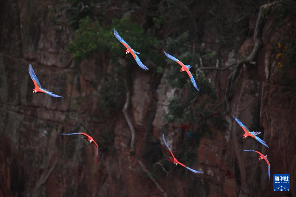 3月19日,金刚鹦鹉在巴西南部南马托格罗索州雅尔丁市的“金刚鹦鹉洞”飞翔。