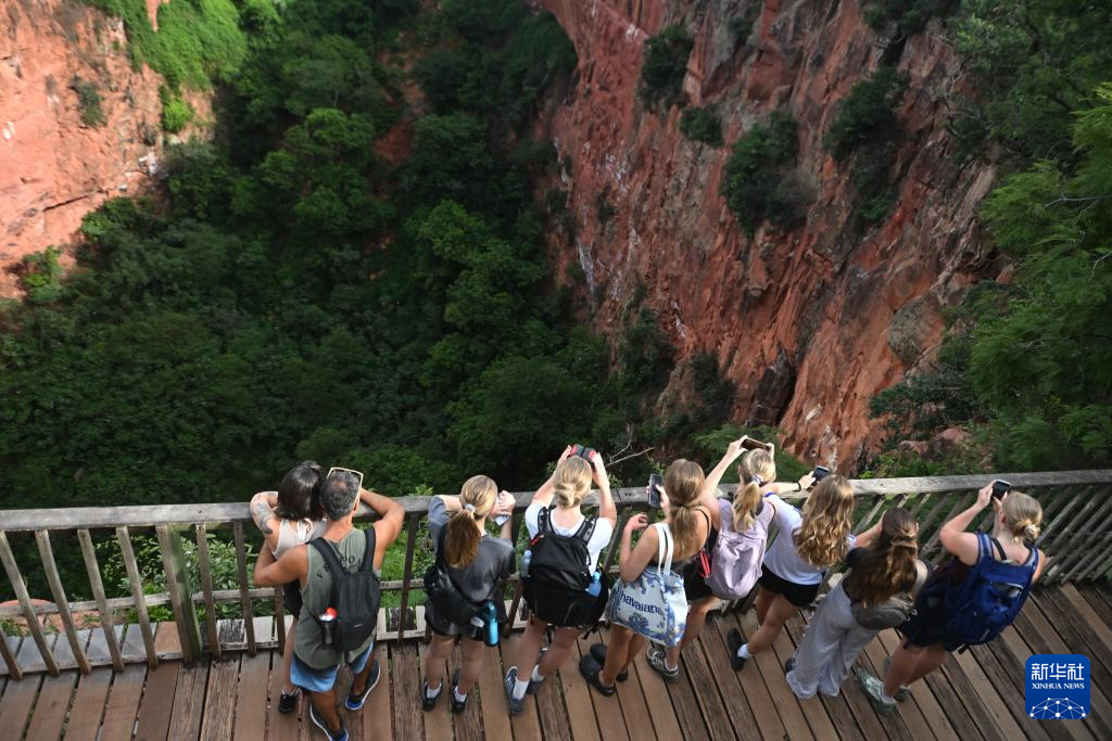3月19日,游客在巴西南部南马托格罗索州雅尔丁市的“金刚鹦鹉洞”观察金刚鹦鹉。