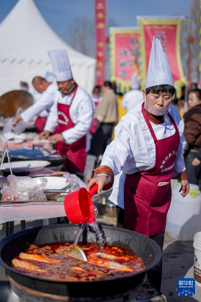 3月20日,厨师在呼和浩特黄河开河民俗文化周活动现场炖鱼。