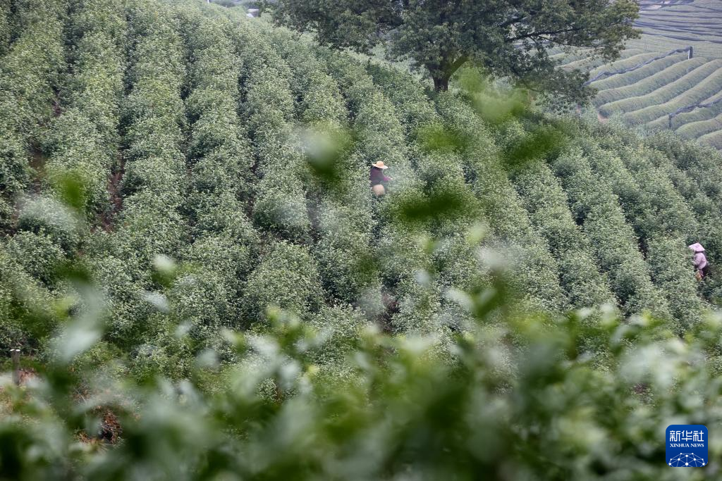 3月20日,在湖南省永州市江华瑶族自治县桥市乡大鱼塘村,茶农在茶园采茶。