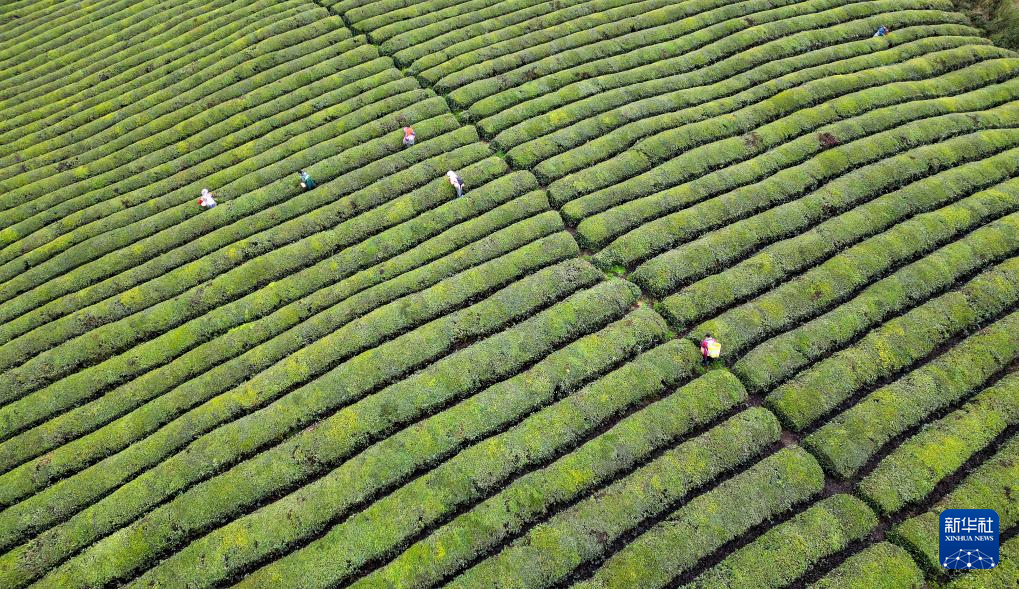 3月20日,茶农在贵州省遵义市余庆县龙溪镇的茶叶基地采茶(无人机照片)。