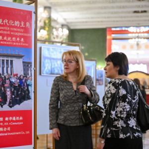 3月20日,在俄罗斯首都莫斯科,嘉宾参观“繁花绽放:中国式现代化的主角”中国妇女事业发展成就图片展。