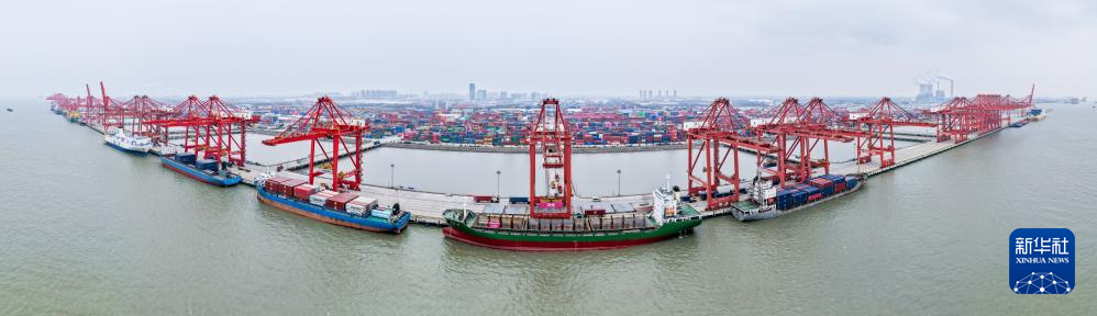 这是3月20日拍摄的繁忙的江苏太仓港集装箱码头(无人机拼接照片)。