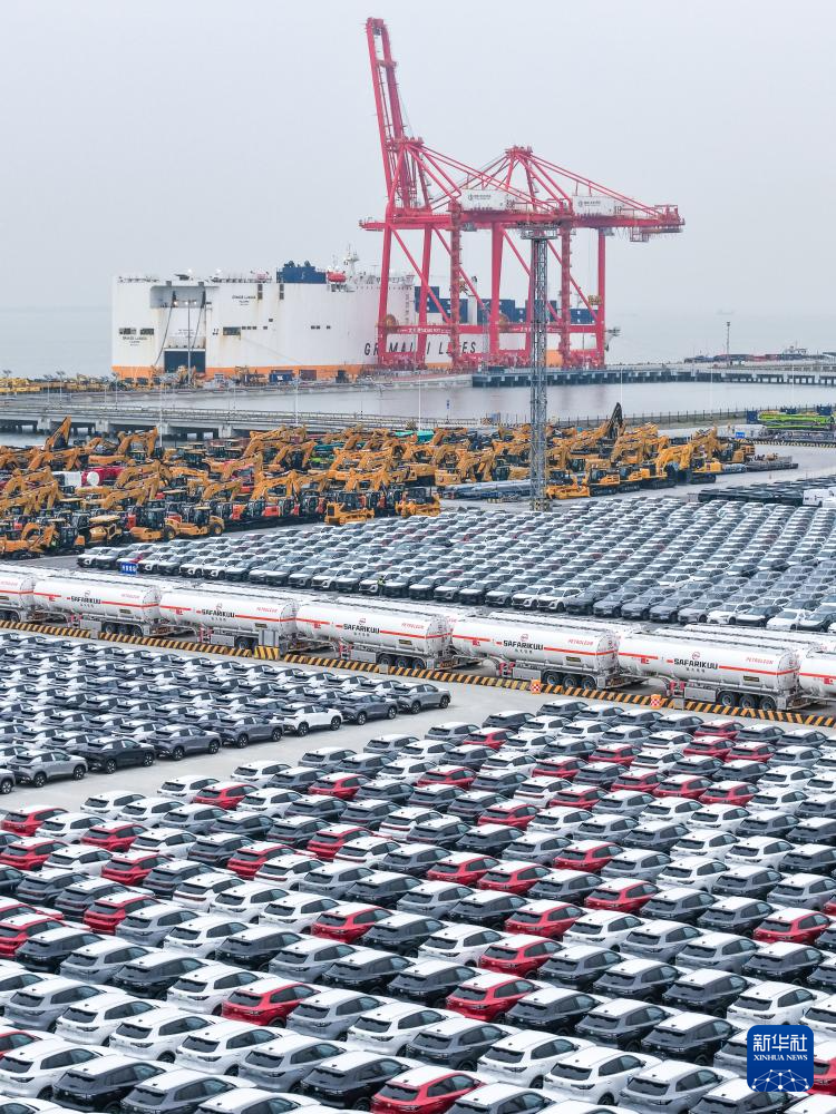 3月20日,在江苏太仓港,国产汽车有序登船,装载约2800辆商品车的“卢旺达盛世”号集滚一体船即将启程前往非洲(无人机照片)。