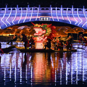 3月22日,在北京市朝阳区亮马河水碓桥附近的水域上,来自广西阳朔的民俗项目“金龙巡游”精彩上演,众多竹筏首尾相连,宛若金色长龙,点亮春夜。