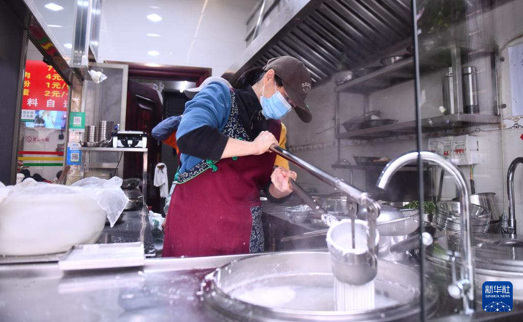 在广西河池市大化瑶族自治县古江大道一家生榨米粉店,工作人员在为顾客制作生榨米粉(3月21日摄)。