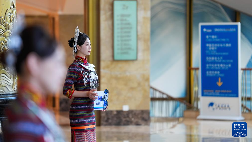 这是3月23日在博鳌亚洲论坛大酒店拍摄的身着黎族服饰的引导员。