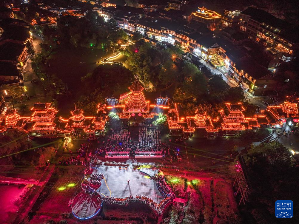 这是3月23日在贵州省黎平县肇兴侗寨拍摄的“大鸾和鸣·天地交响”文化交流专场晚会现场(无人机照片)。