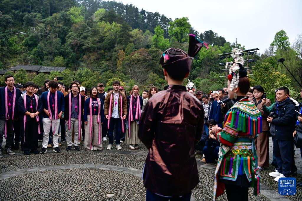 3月23日,侗族群众在贵州省黎平县肇兴侗寨为来宾举办寨门迎宾仪式。