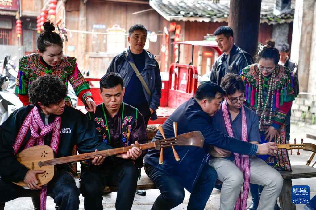3月23日,侗族青年在贵州省黎平县肇兴侗寨的鼓楼下演唱侗族琵琶歌。