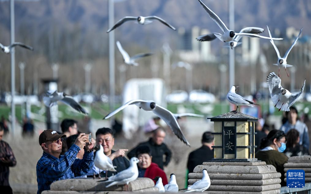 3月25日,游人在乌海市乌海湖岸边给红嘴鸥喂食。