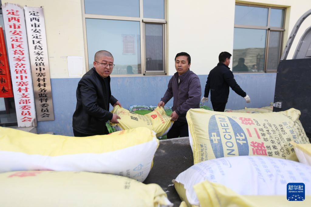 3月24日,甘肃省定西市安定区城市管理局驻村帮扶工作队的工作人员在葛家岔镇中寨村帮助村民装运农资。