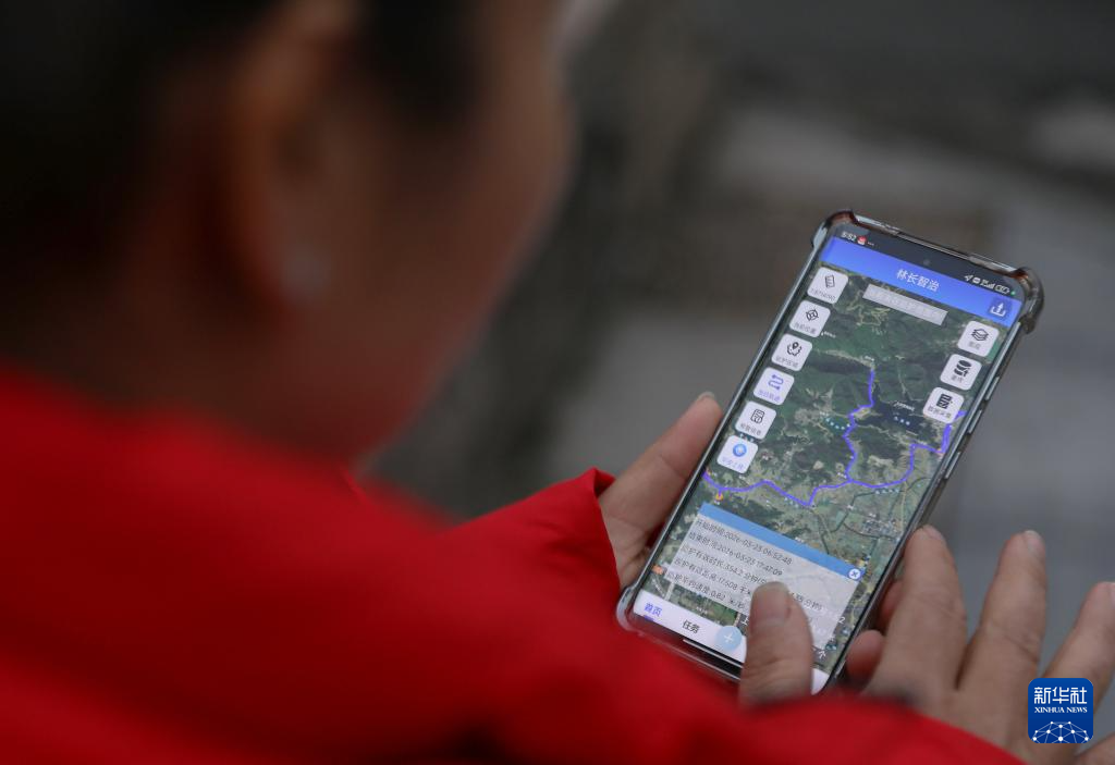 3月23日,在浙江省宁波市镇海区九龙湖镇,一名护林员查看手机上的巡护路线记录。该镇护林员须使用手机应用程序,在巡护点打卡,并记录巡护路线、时长等信息,方便查漏补缺。