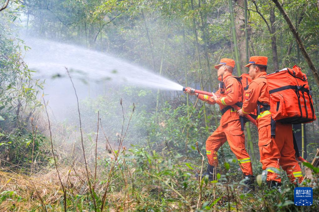 3月24日,在浙江省宁波市鄞州区,当地综合森林火灾应急救援队队员使用移动水泵进行灭火演练。
